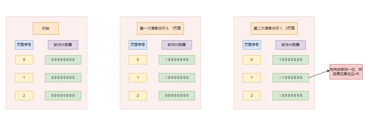 NFU(Not Frequently Used)算法,将每个页面与一个软件计数器相关联,每次时钟中断将页面的R位(0或1)加到页面对应的软件计数器上,替换时找到计数器上值最小的页面淘汰。相当于跟踪了页面访问的频繁程度。